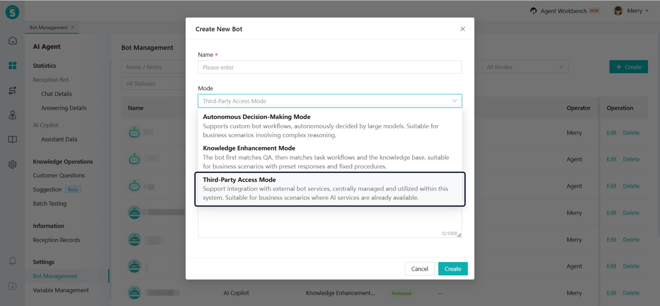 Some large enterprises have built their own knowledge bases or Agent platforms internally, which can perform intelligent Q&A. Based on this, these enterprises expect to use the visitor client, bot statistics, operation, and other related capabilities provided by Sobot to achieve a unified service entry and data management. Therefore, Sobot has added a third-party bot access function.