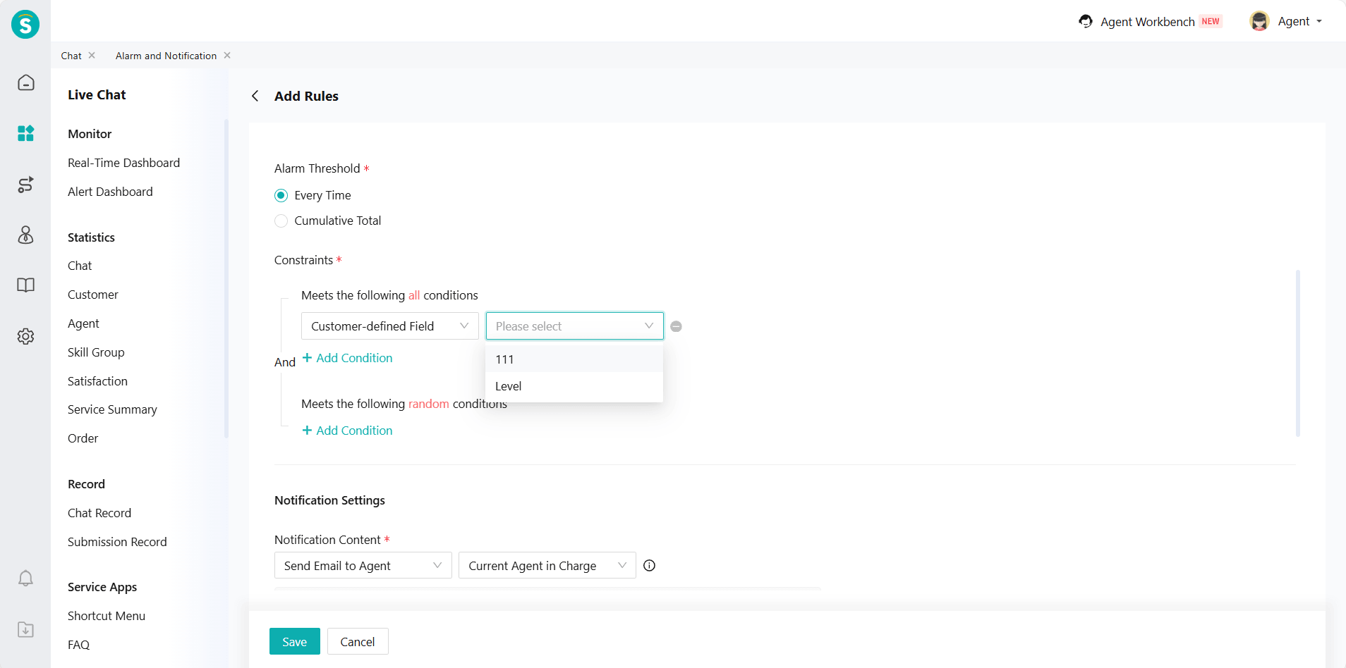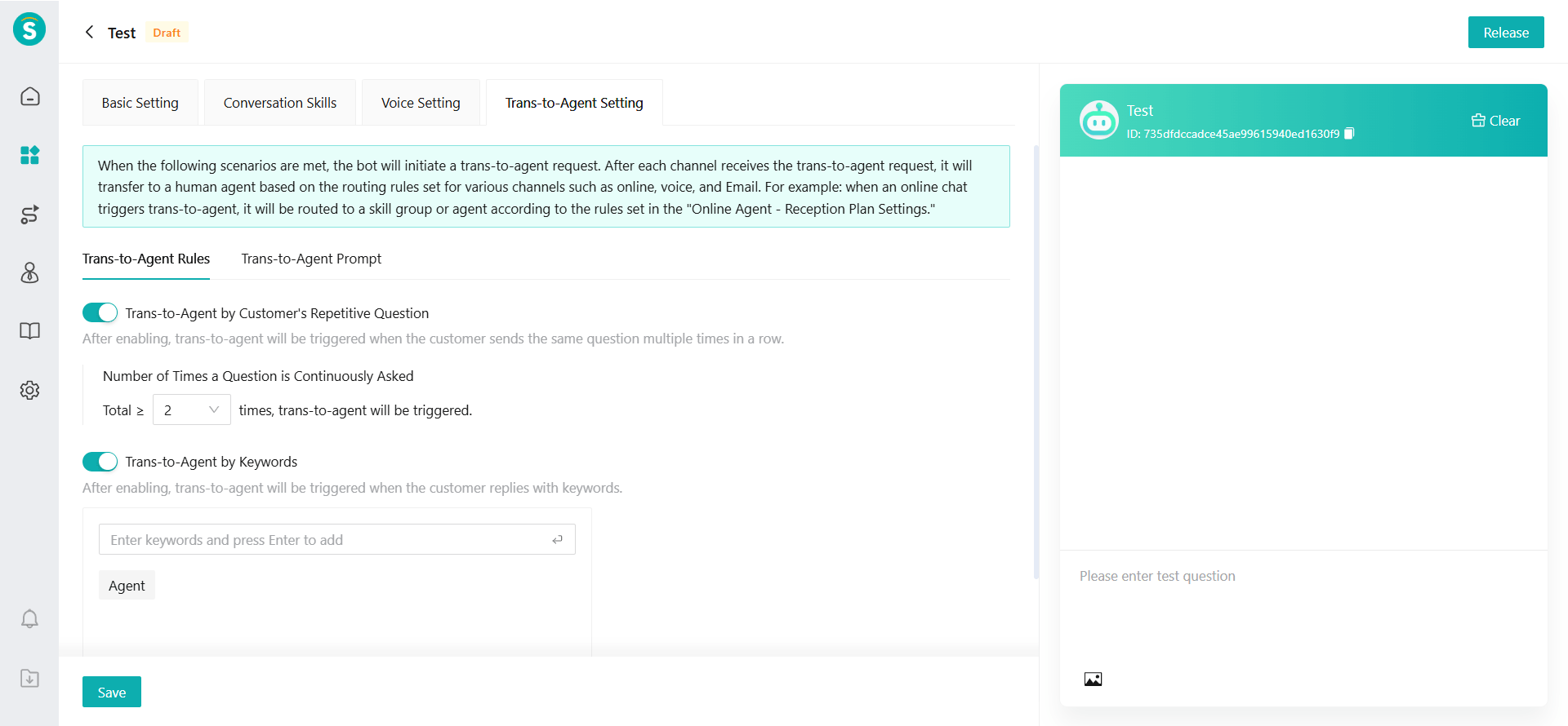 ii. Configure transfer-to-agent rules: After configuring the transfer-to-agent rules, if a customer matches the rules, a manual transfer message will be sent simultaneously.