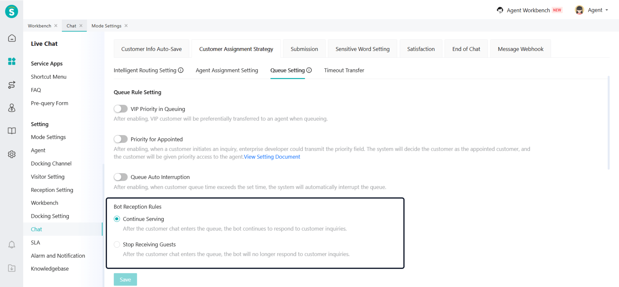 - When the Mode Setting is set to Real-Time Reception Mode, the Bot Reception Rules configuration is added under Chat - Customer Assignment Strategy - Queue Setting. By default, it is set to Continue Serving, and enterprises can switch it to Stop Receiving Guests based on their actual needs.
