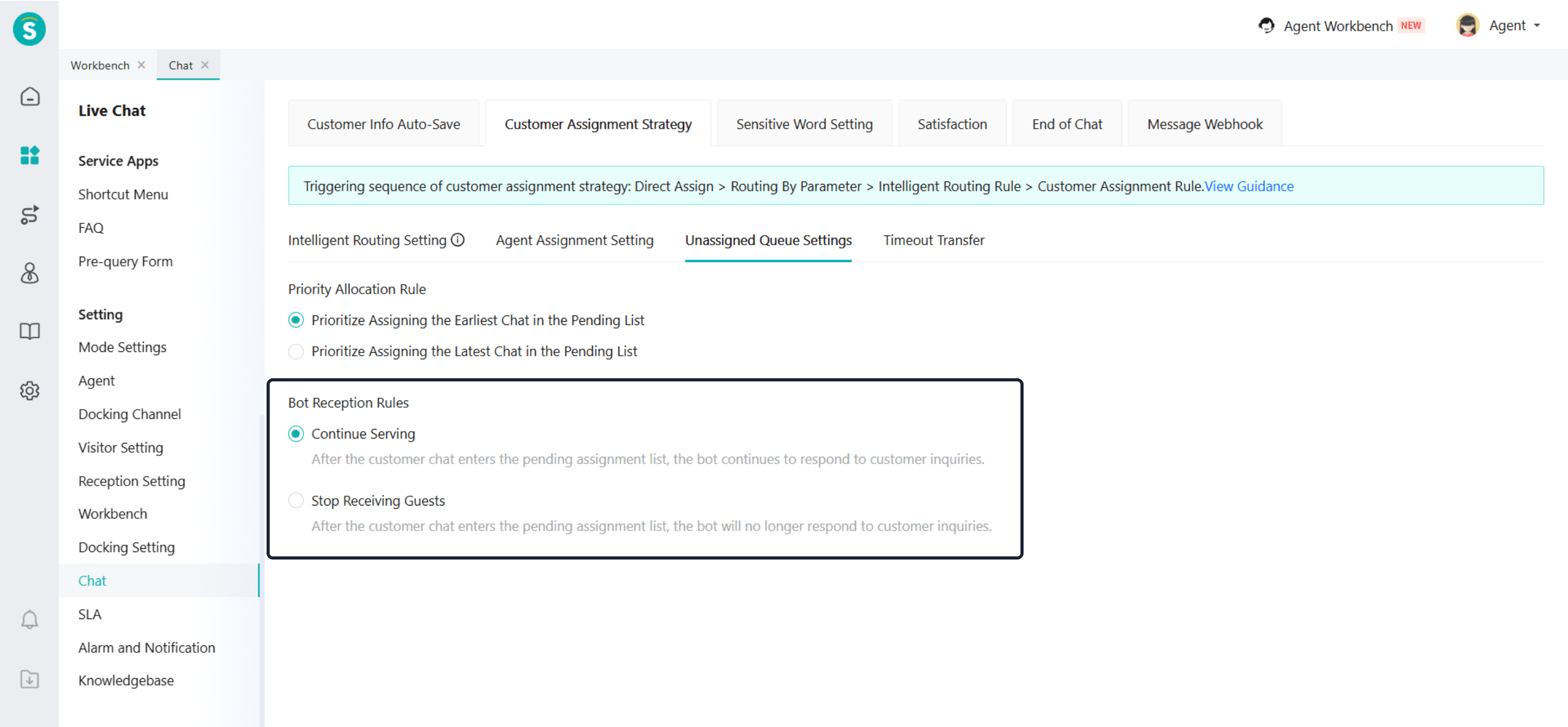 - When the Mode Setting is set to Always On Reception, the Bot Reception Rules configuration is added under Chat - Customer Assignment Strategy - Unassigned Queue Settings. By default, it is set to Continue Serving, and enterprises can switch it to Stop Receiving Guests based on their actual needs.