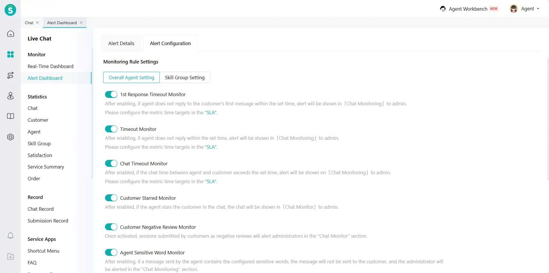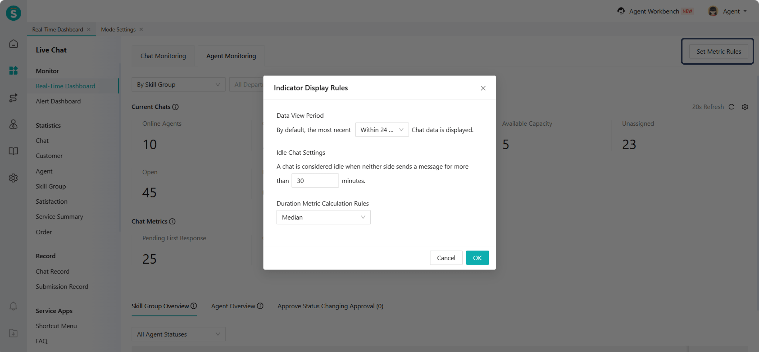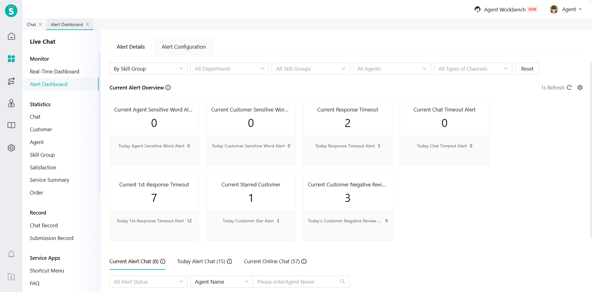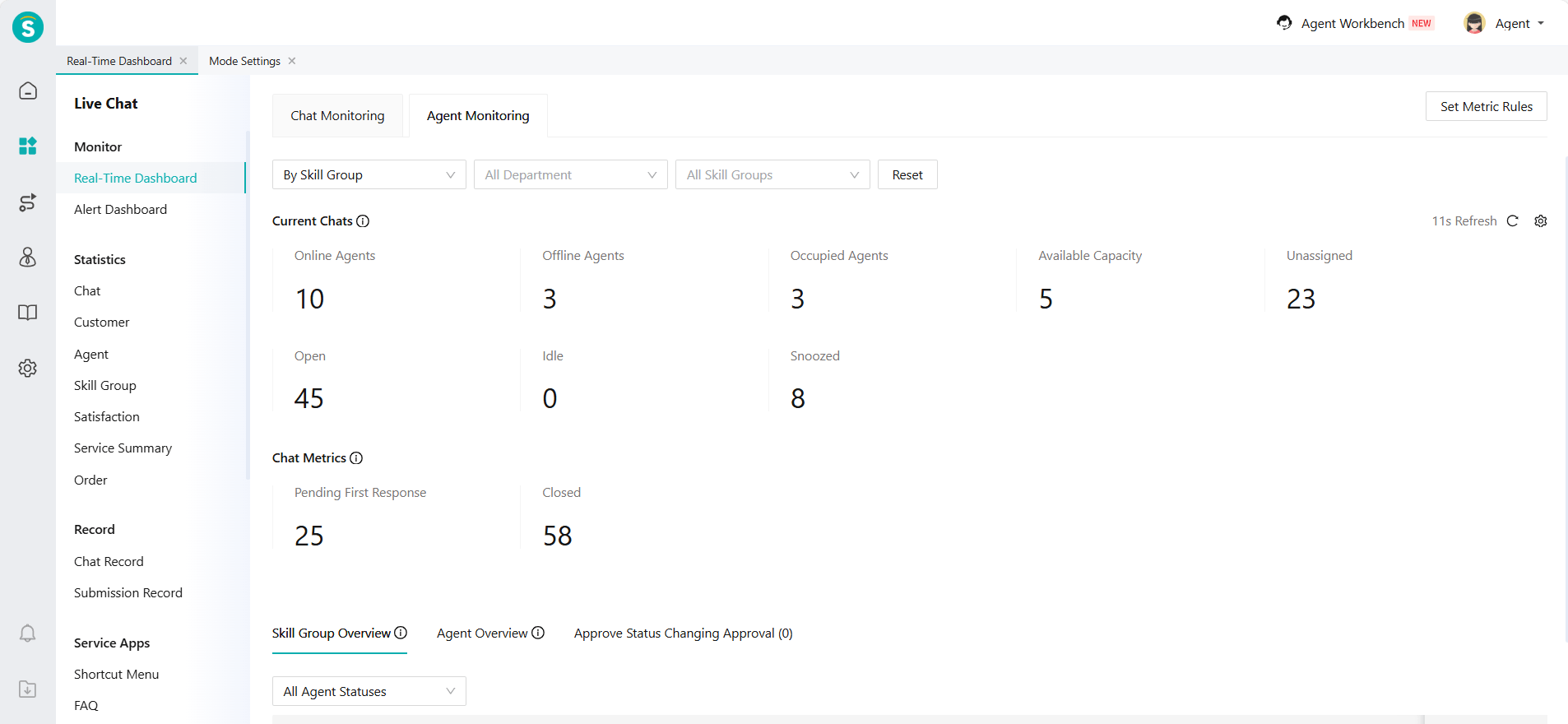 - New Agent Monitoring: Current Chats, Chat Metrics; skill groups and agent both add new metrics such as unassigned sessions, snoozed sessions, and idle sessions.