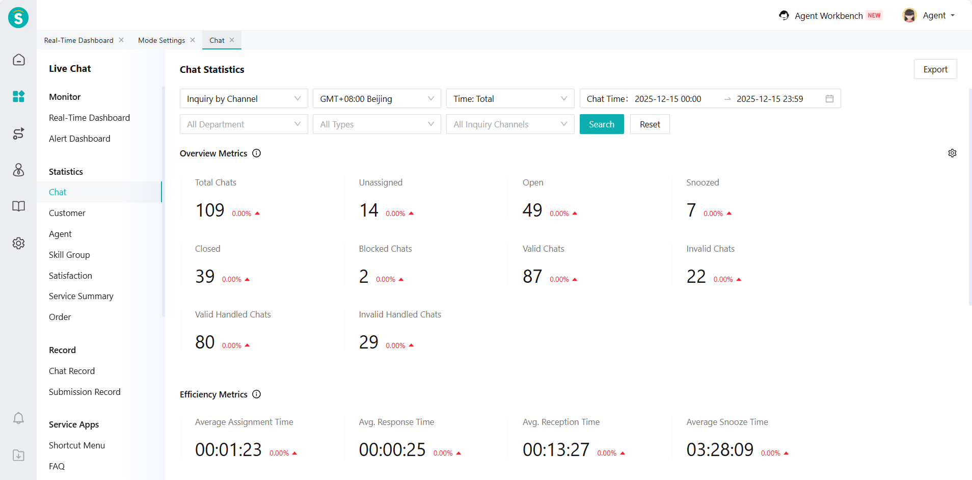 Add overview metrics and efficiency metrics. Among the overview data, the number of unassigned sessions, the number of open sessions, and the number of snoozed sessions are metrics during the session process. Other data will only be included in the statistics after the session ends.