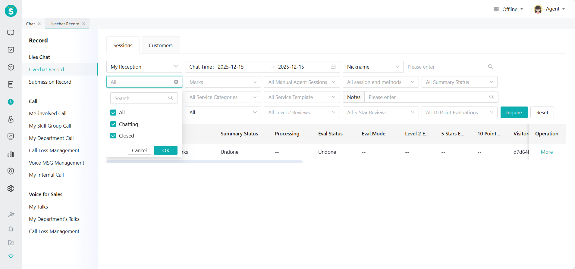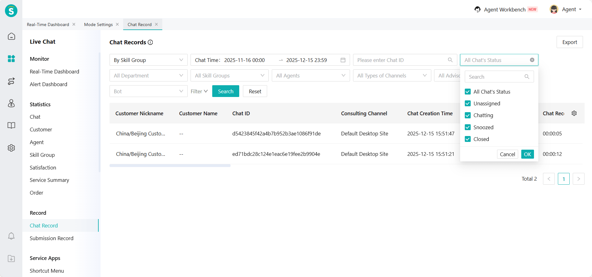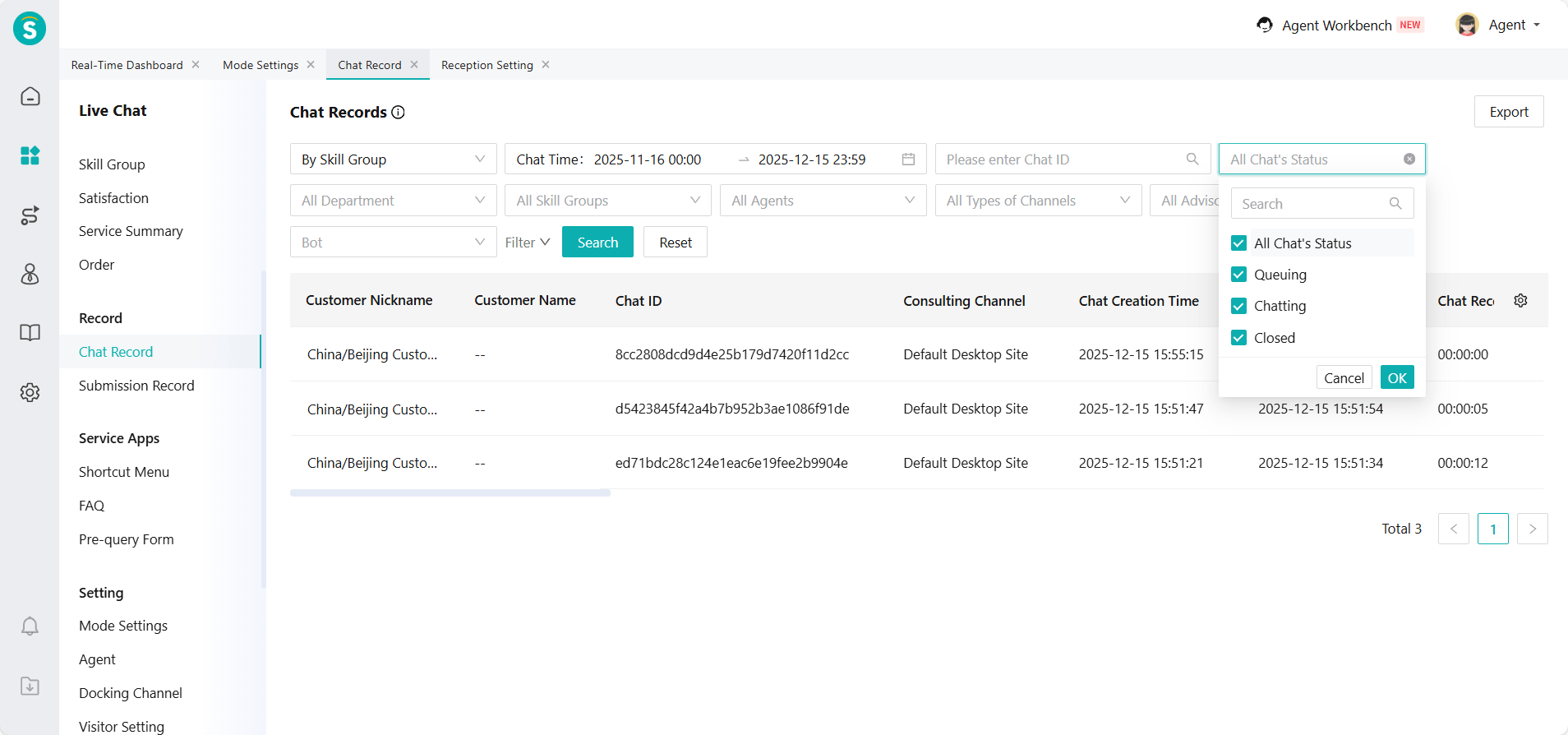 a. When the Mode Setting is set to Real-Time Reception Mode, the Chat Records add a new session status filter. It supports querying records of sessions that are queuing, chatting, and closed.