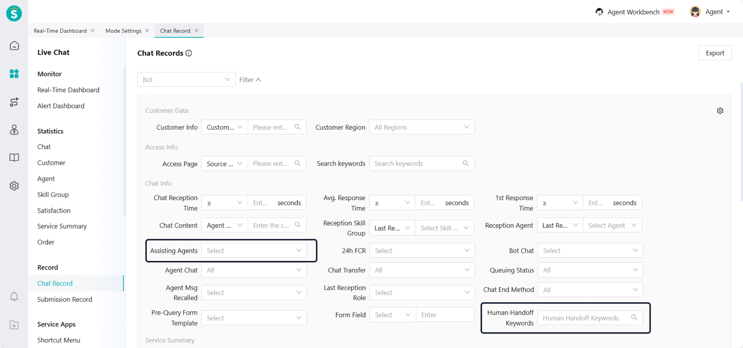 c. Chat Records add assisting agents and human handoff keywords (excluding AI Agent) search.