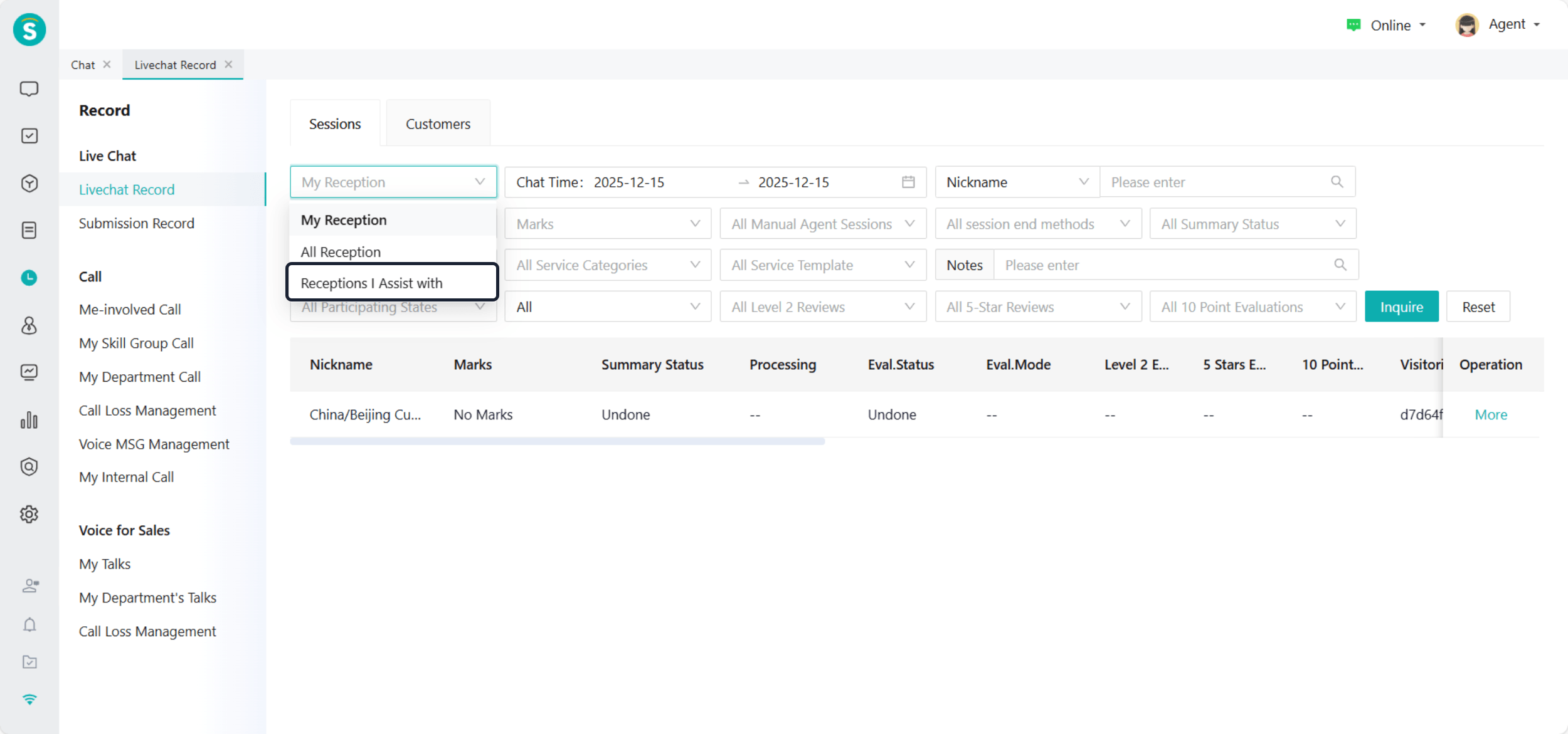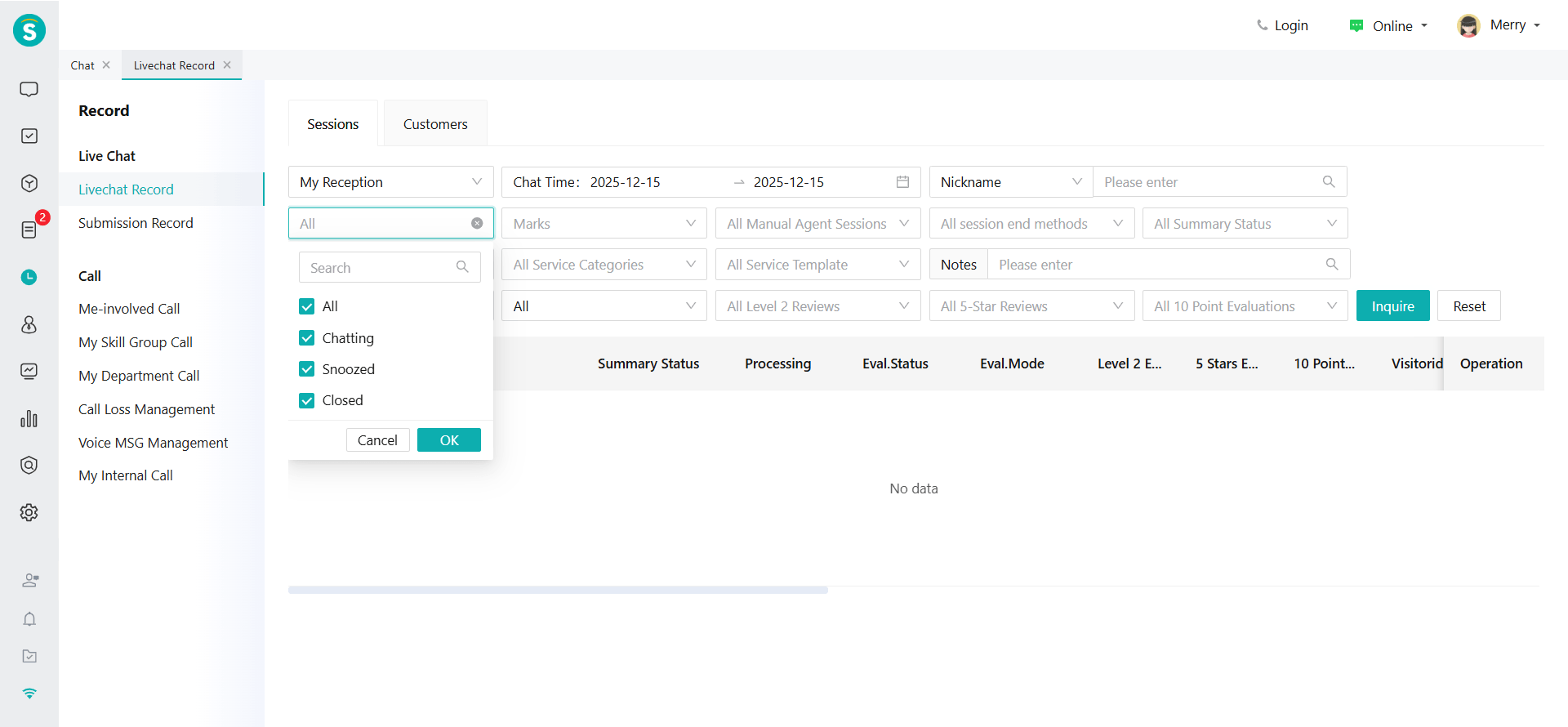 a. When the Mode Setting is set to Real-Time Reception Mode, the Record - Sessions add a new session status filter. It supports querying records of sessions that are chatting and closed.