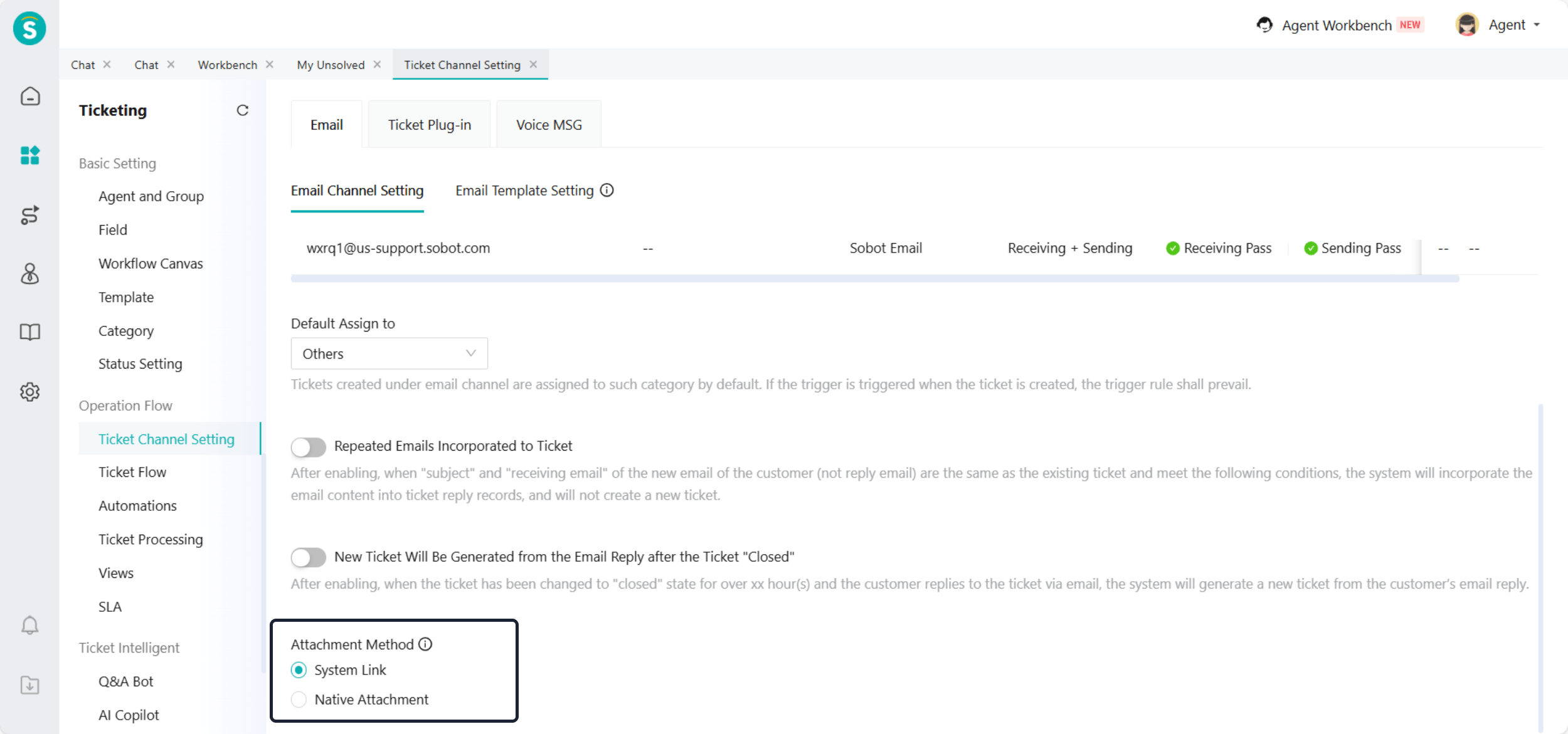 Ticket Channel Setting - Email, supports selecting email attachment methods, including: