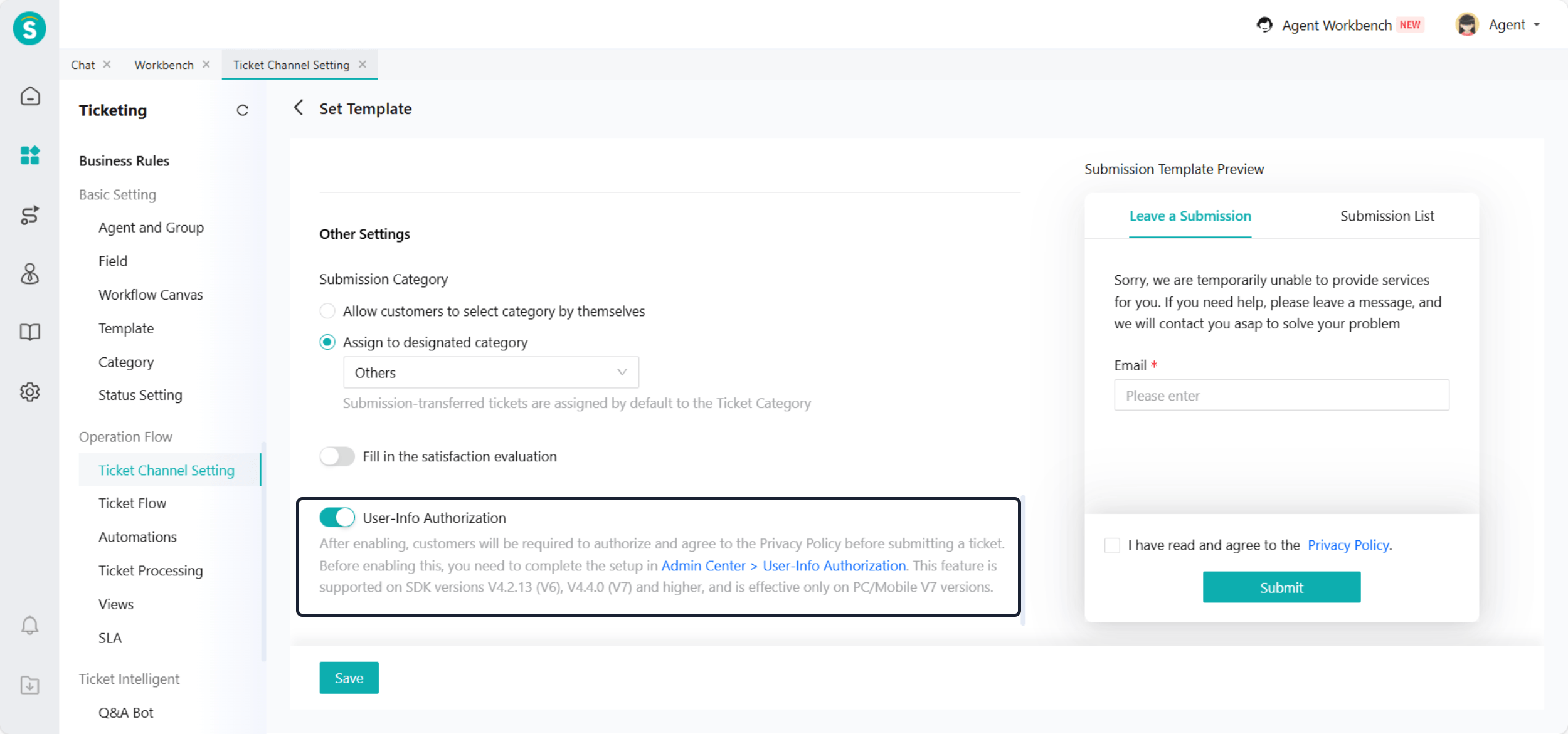 - In the Ticketing - Business Process - Ticket Channel Settings - Ticket Plug-in - Configure Submission Template, enable User-Info Authorization.