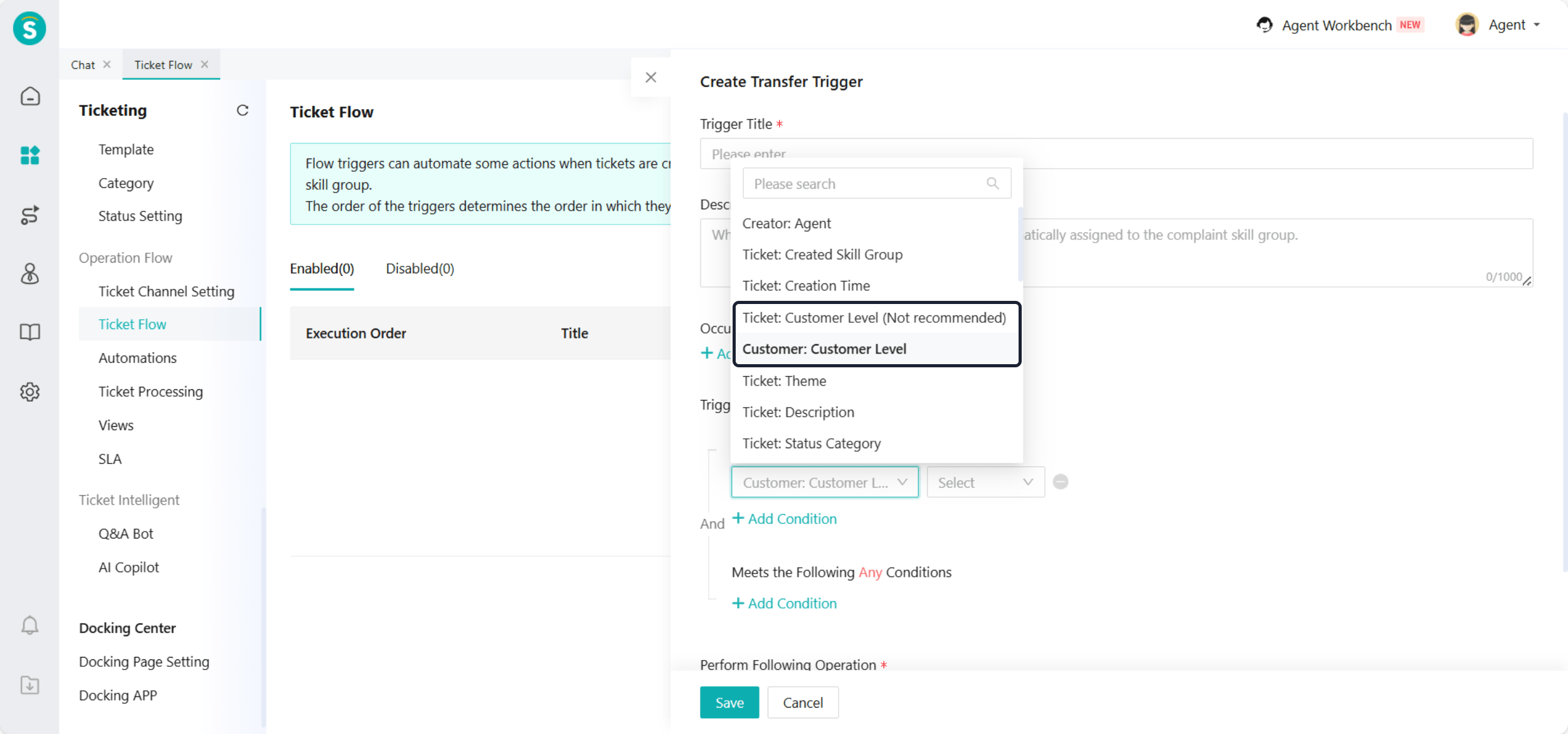 In the Ticket Flow, Automateds, and Views settings, a new trigger/view condition for customer level has been added. The original condition "Ticket: Customer Level" is not recommended for use by enterprises.